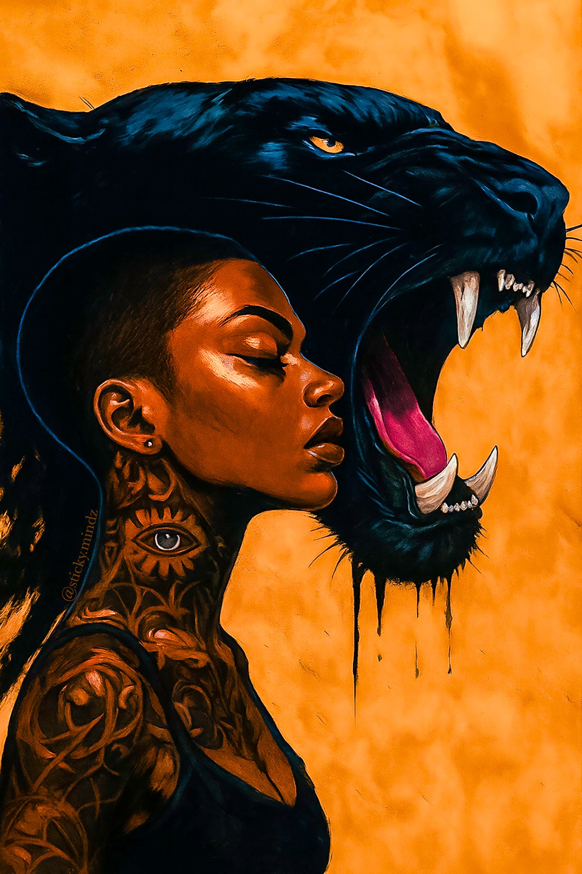 Callin’ captures the duality of stillness and strength, the sacred roar within. A radiant Black woman stands rooted in her truth, adorned with cosmic ink and inner knowing, while a black panther bellows behind her, not as threat, but as echo.
