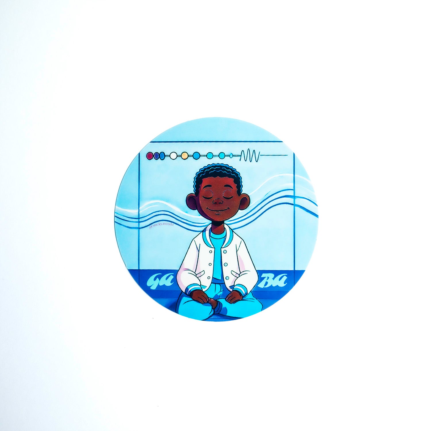 This sticker celebrates GABA, the brain’s own gentle messenger, through the image of a peaceful kid sitting in stillness. Waves of soft blue echo a quiet rhythm, reminding us how rest, breath, and balance support our body and mind.