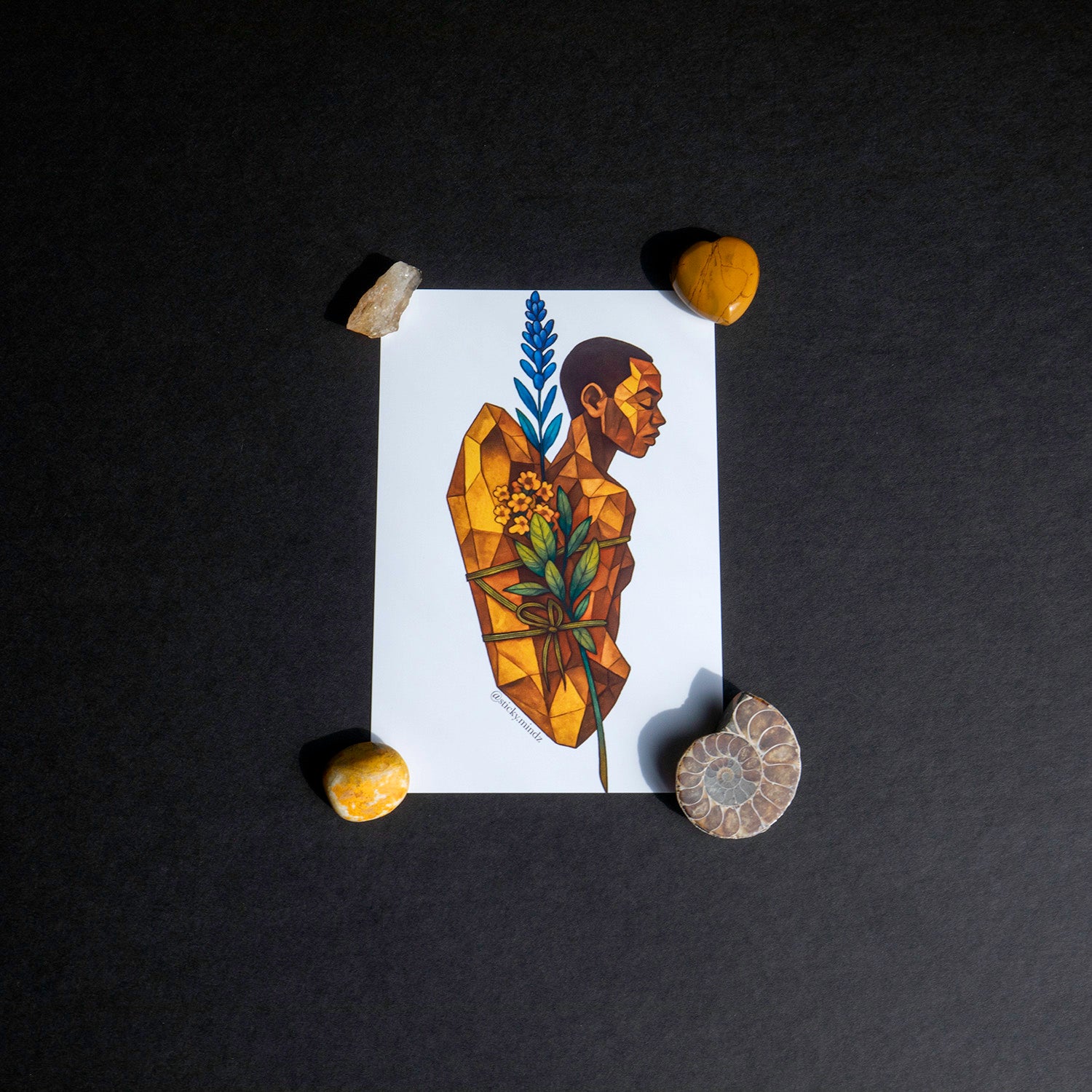 Faceted in warm amber light, he carries the resilience and protection of his namesake stone. Wrapped in leaves and blossoms, he reflects the balance of power and serenity.