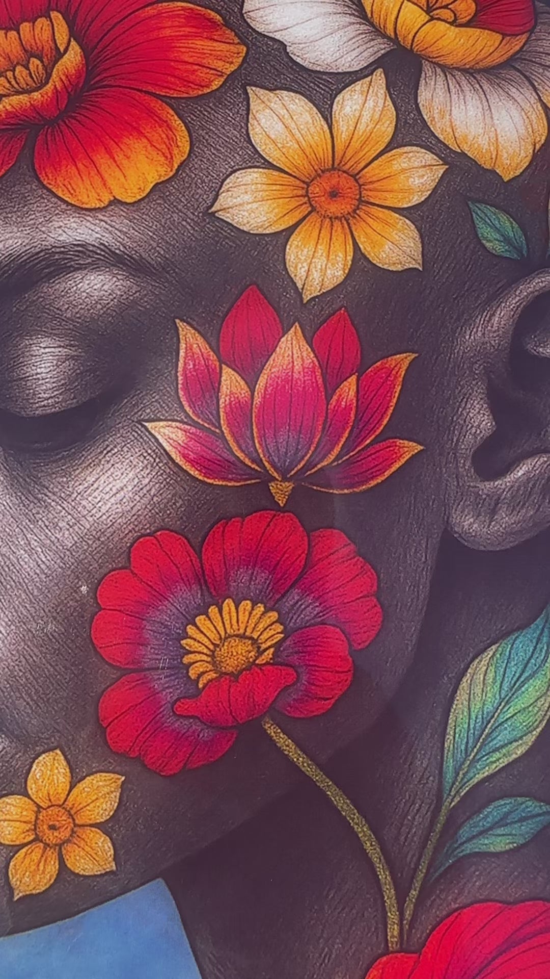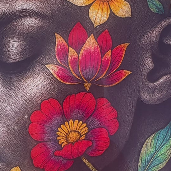 Rooted in rich earth and ancient knowing, she holds the grace of generations in her stillness. Her skin speaks in petals, each one a whisper of those who came before. With eyes closed, she drifts inward—into the soil, into the stars, into the stories braided into her being.